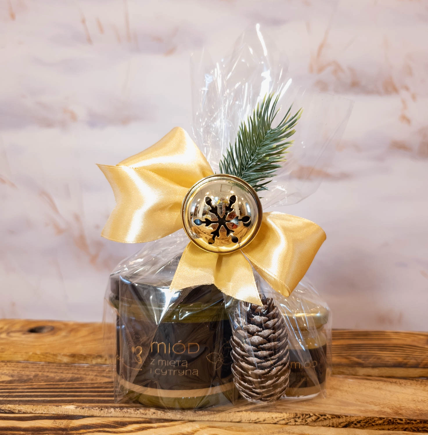 Magia świąt w słodkim wydaniu! Elegancko zapakowany zestaw miodów w celofanie ze świątecznymi dekoracjami — gotowy, by obdarować bliskich.