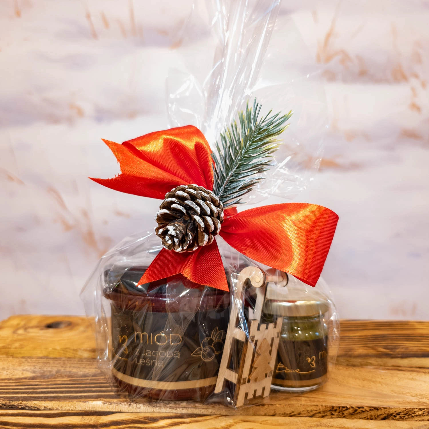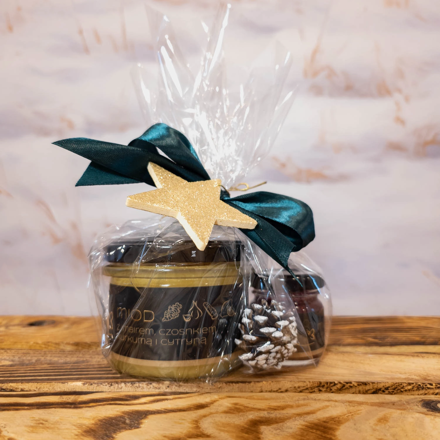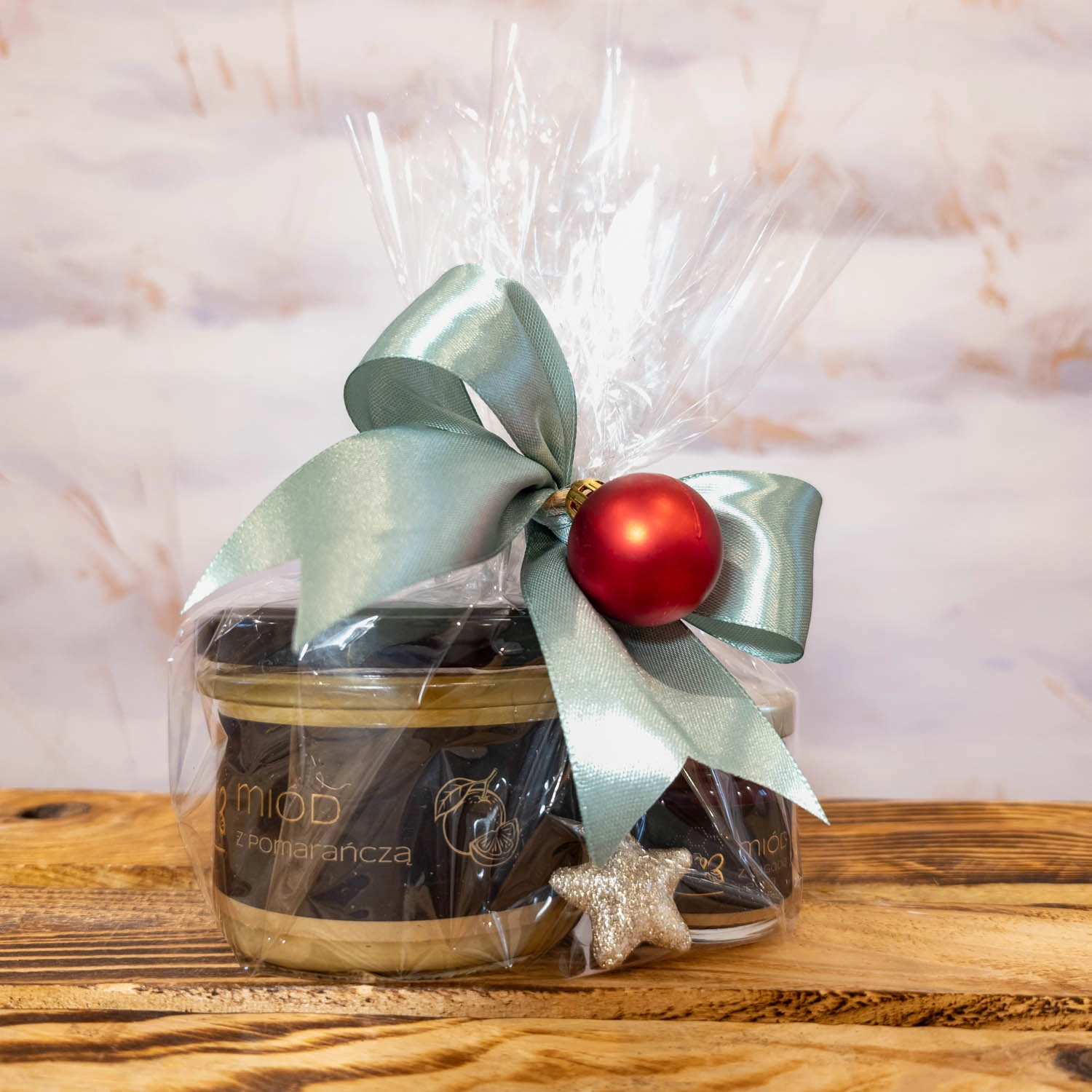 Zestaw w celofanie: miód 245g + miód 40g z ozdobami świątecznymi Dodaj do koszyka – 30,00